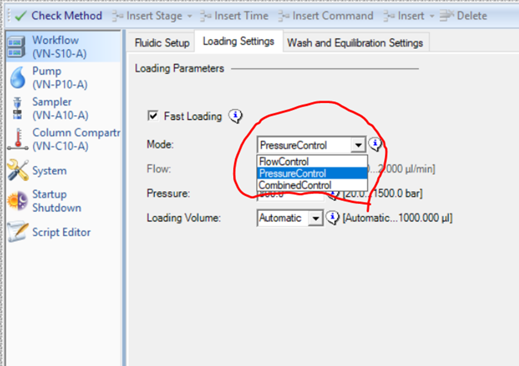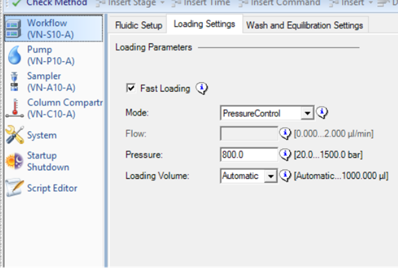 컬럼의 압력, 유속, 혹은 두가지를 합쳐서 설정할수 있습니다. 유속만을 설정했을 경우 만약 컬럼이 막혀있을 경우 문제가 될수 있습니다. 설정한 유속까지 올리는 과정에서 고압이 생겨서 시스템에 문제를 일으킬수 있습니다. 압력으로 설정해 놓으면 일단 그 압력 이상으로는 올라가지 않습니다. 하지만 만약 컬럼이 막혔을 경우 설정한 압력에서 매우 낮은 유속으로 진행될수 있습니다. 그러면 상당히 많은 시간이 걸립니다. 두가지를 합쳐놓으면 둘중에 먼저 도달하는 시점에서 진행됩니다. 개인적으로는 그냥 압력만으로 설정합니다. 만약 trap-column을 장착하지 않고 분석컬럼만을 장착한 적절한 설정이 중요합니다. 그렇지 않으면 컬럼이 손상되거나 Loading 되는 시간이 매우 길수 있습니다. 설정한 컬럼정보와 일치하는 않는 값을 입력하면 경고메세니가 나옵니다. EasySpray 컬럼의 경우 높은 압력에서도 견딜수 있으므로 높은 압력값을 설정할수 있습니다. 보다 빠르게 진행이 될수 있습니다.