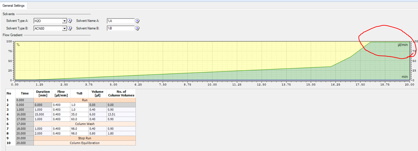 이 장비는 분석이 끝난후 Equilibrium을 진행합니다. 다음 분석을 위해서는 컬럼안의 조건이 초기 조건이 되어야 합니다. 이러한 이유로 일반적인 장비의 LC gradient 에는 washing 후 equilibrium 과정을 포함시킵니다. 하지만 Washing 과정에서 모든 펩타이드가 다 용리되기 때문에 Equilibrium 과정에서는 펩타이드가 전혀 검출되지 않습니다. 질량분석에 있어서는 불필요한 시간입니다. 이러한 이유로 Vanquish Neo는 질량분석기의 검출이 LC gradient의 Washing이 끝나는것과 동시에 끝낼수 있습니다. 질량분석기의 검출이 끝나면 LC만 추가적으로 equilibrium이 진행됩니다. 이 경우 동일한 LC run time을 최대한 활용할수 있습니다.. 아래 그림과 같이 98% Buffer B에서 분석이 끝납니다. 하지만 다음 분석전에 LC만 Equilibrium을 진행하고 다음 분석을 준비합니다.