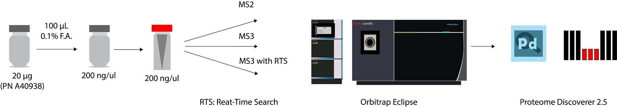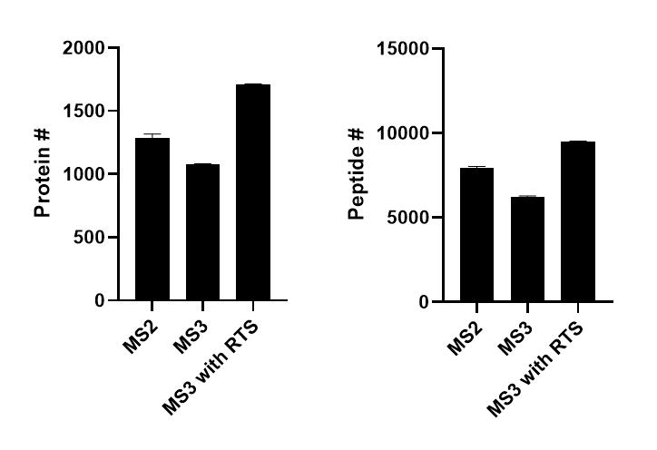 각 조건마다 두번씩 분석한후 Proteome Discoverer 2.5로 분석하였습니다. Proteome discoverer에서의 분석에는 RTS가 포함되었는것과 포함되지 않는것에 구분이 없습니다. 하지만 MS3는 MS2와 검색방법이 약간 다릅니다. MS3 방법에서의 MS2는 iontrap으로 진행됨으로 tolerance가 높습니다 (여기서는 0.6 Da). MS3 스펙트럼으로는 펩타이드 검출이 아닌 reporter ion의 정량분석만 합니다.