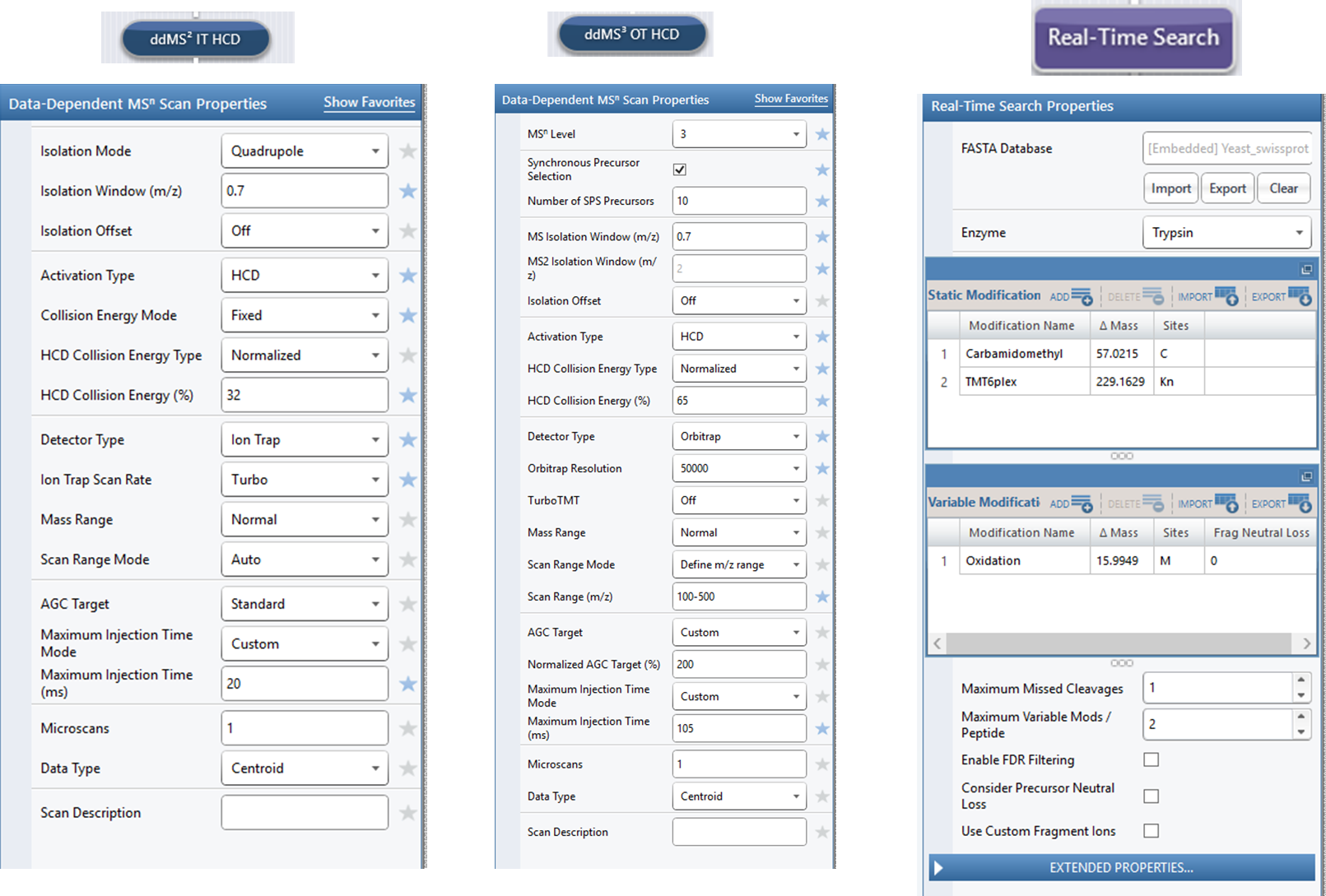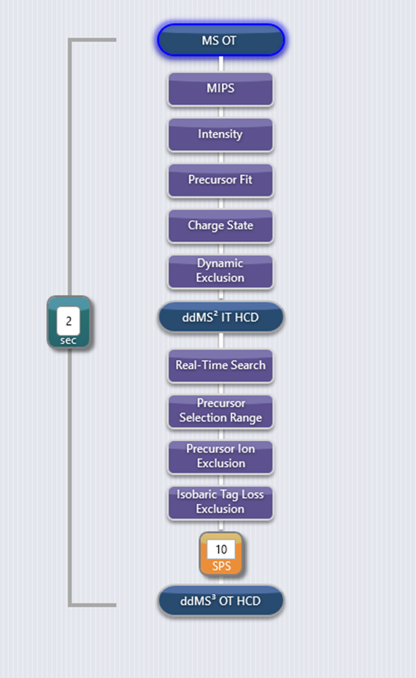 아래는 전체적인 MS method입니다. MS2까지는 일반적인 방법으로 진행됩니다. MS2는 HCD fragmentation과 Iontrap detector를 사용합니다. 속도가 빠른 iontrap의 장점을 잘 살릴수 있습니다. 얻어진 MS2 스펙트럼을 이용하여 실시간으로 검색이 된후 MS3를 수행할것인지 수행한다면 어떤 peak들을 선택할지 결정합니다.