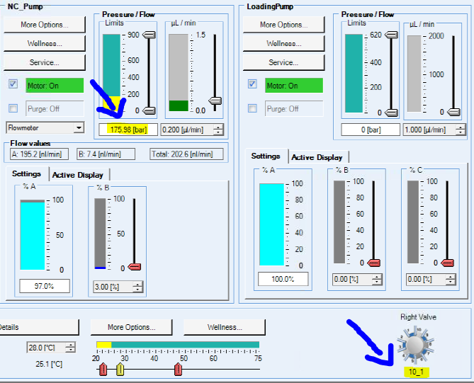 쉽게 확인하는 방법은 LC가 작동하는 상태에서는 manual로 valve를 회전시켜 보면서 nano pump의 압력변화를 확인하면 된다. 정상 상태라면 Valve 회전시 1~2초간 약간의 압력변화가 있으나 바로 원래 압력으로 돌아온다. 하지만 비정상적일때는 원래 압력으로 되돌아오는 시간이 많이 걸리든지 압력이 떨어진다.