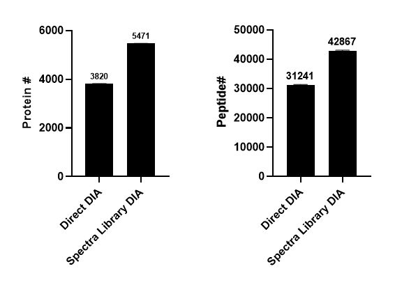 또한 Exploris480으로 분석했던 200ng HeLa (60min) 데이타를 이용하여 Direct DIA와 Spectra library-based DIA를 비교해보았습니다. Spectra library로 분석한 결과에서 더 많은 단백질과 펩타이드가 검출이 되었습니다.