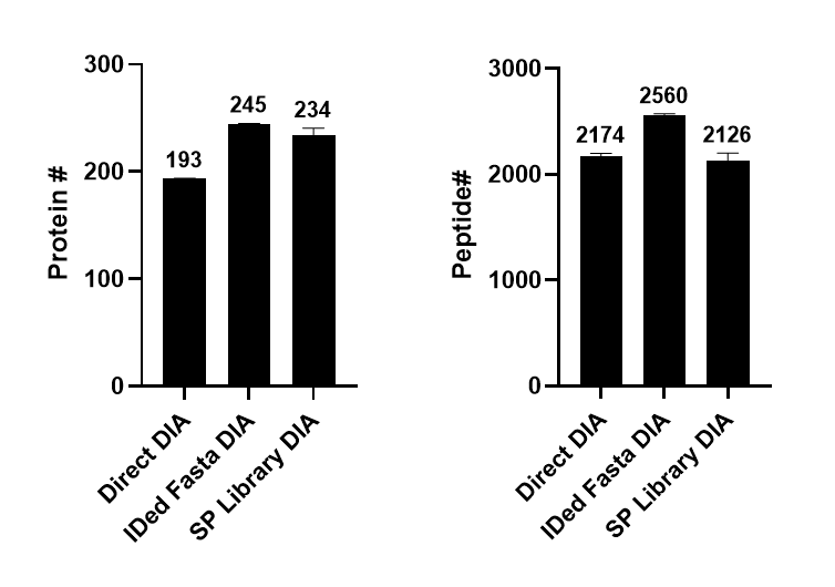 아래는 각각의 방법에서 검출된 단백질 및 펩타이드의 수입니다. 60min LC time이고 혈액단백질이라 검출된 수는 많지 않습니다. 3가지 방법중에는 검출된 단백질로 만든 fasta로 분석한 direct DIA 방법에서 더 많은 단백질및 펩타이드가 검출이 되었습니다.