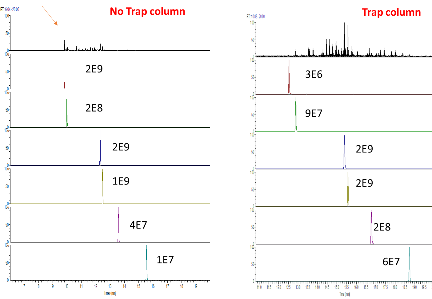이전의 테스트에서 보았듯이 Trap-colum을 사용할 경우 Direct injection에 비해서 경우에 따라 시료의 손실이 어느정도 있을수 있습니다.
