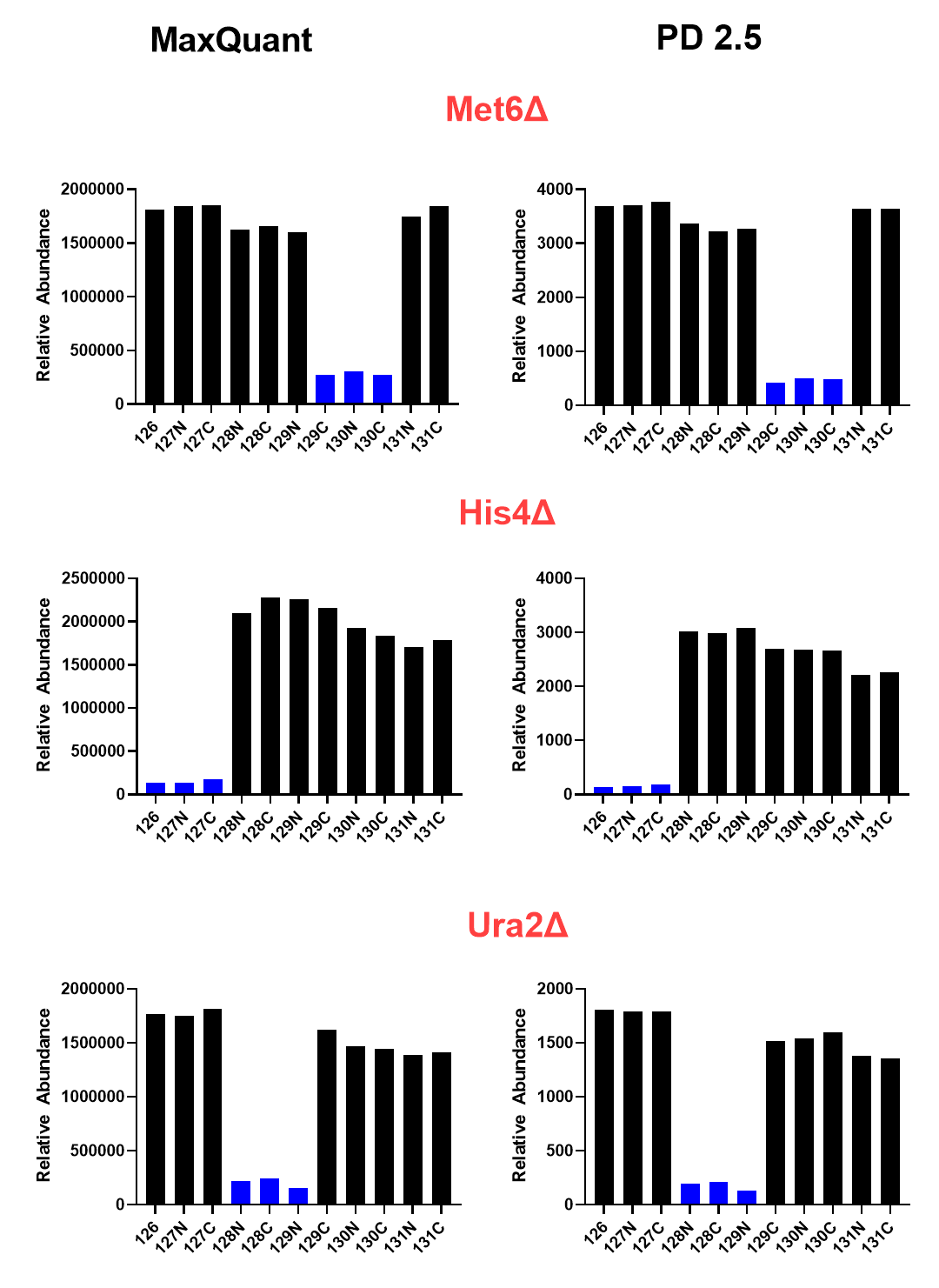 아래는 Deletion된 3개의 단백질에 대한 상대적인 정량값비교입니다. 상대적인 정량값은 두 프로그램이 거의 유사한것 같습니다. 정량성면에서는 차이를 보이지 않습니다.