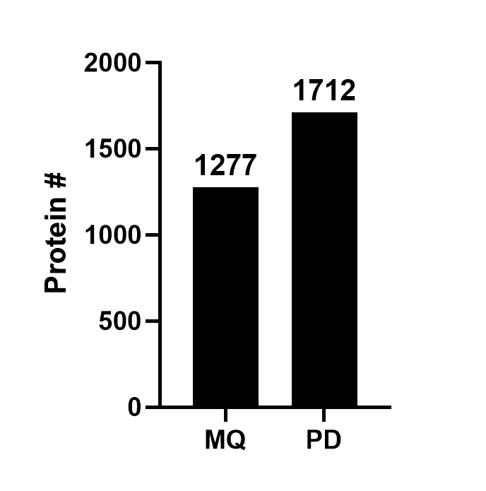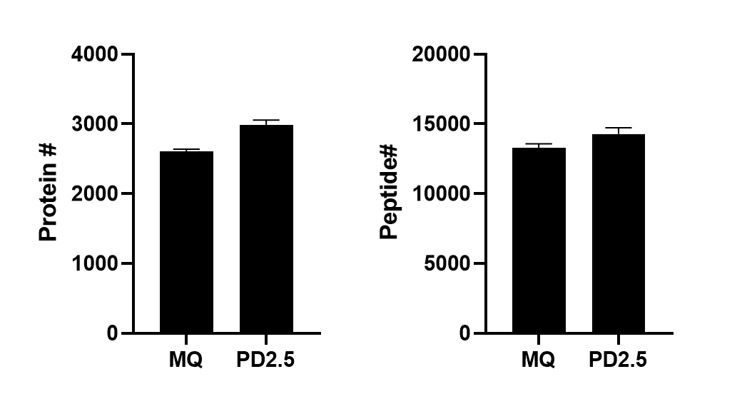 MS3 SPS Real time Search 방법으로 얻어진 결과입니다. 여기서도 PD2.5에서 약간 많은 수의 단백질이 검출되었습니다. 검출된 단백질의 수는 아래와 같습니다. PD2.5에서 약간 더 많이 검출이 되었습니다.