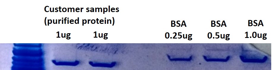 이것은 두가지 목적이 있습니다. 외뢰자가 사용한 Buffer를 제거하기 위함이고 또한 Band(Coomassie dye)의 진하기를 통해 단백질의 양을 대략 예측하기 위합니다. 일반적으로 Coomassie blue 염색시 band가 최소한 눈에 보여야 됩니다.