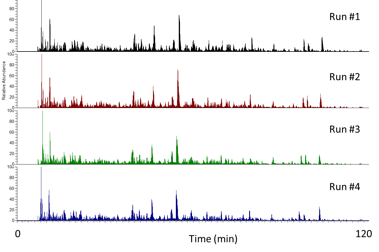 특히 펩타이드들이 거의 118분까지 용리된후 그 다음부터는 더 이상나오지 않습니다. 전체 120분 시간이 아주 잘 활용된것 같습니다.
