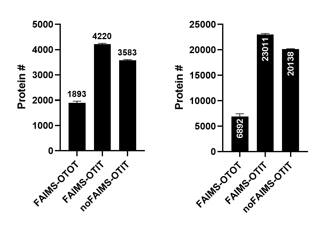 아래는 FAIMS를 사용하여 얻은 OTOT 와 OTIT 더불어 FAIMS 없이 분석한 OTIT 결과 입니다. 특별히 질량분석기의 파라미터를 최적화하지 않은 기본값을 사용하였습니다. 결과에서 보듯이 OTOT에 비해서 OTIT에서 보다 많은 수의 단백질/펩타이드가 검출되었습니다. 또한 특별히 최적화를 하지 않았음에도 OTIT mode의 경우 FAIMS에서 보다 많은 수가 검출되었습니다. 앞으로 최적화를 하면 더 많은 수가 검출될수 있으리라 생각합니다.