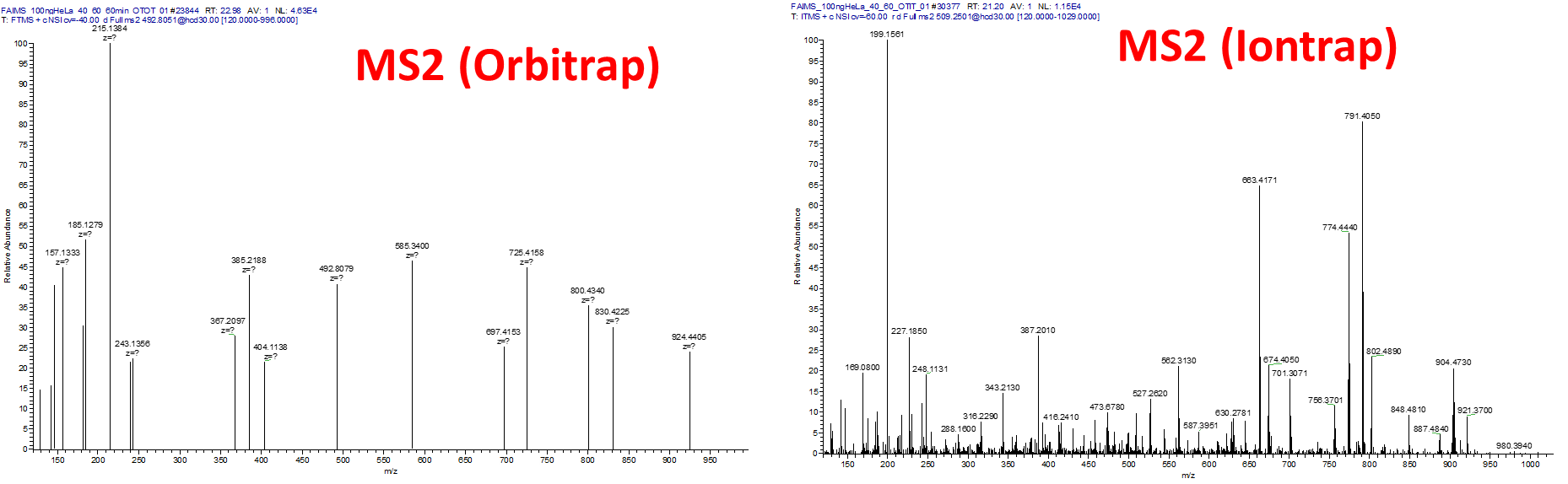 FAIMS를 사용하면 전체적으로 MS1의 TIC값이 줄어들기 때문에 MS2의 파라미터를 조절해야 합니다. 여러논문에서도 FAIMS를 사용시 OTOT보다는 OTIT에서 분석을 하였습니다. 원래 OTIT mode에서 더 많은 단백질/펩타이드를 검출하지만 FAIMS에서 그 효과가 더 차이가 나는듯합니다.