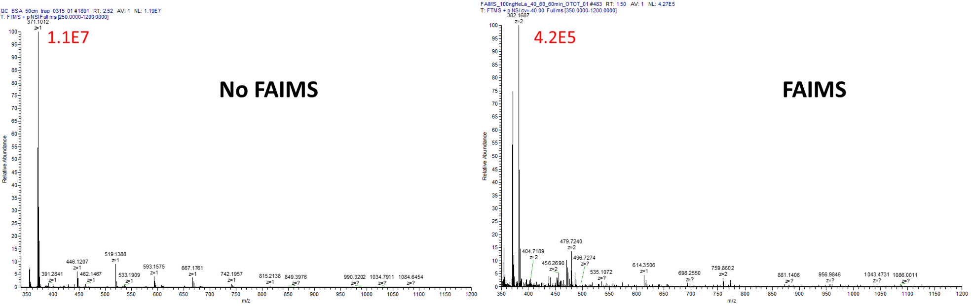 연구소에들어오기전부터 이미 FAIMS 구매를 해놓은 상태라 최대한 활용을 해야할 상황입니다. Orbitrap Eclipse의 성능을 감안하면 FAIMS의 효과가 더 좋지 않을까 생각합니다. 사실 FAIMS를 가지게 되면 기존의 논문에서 처럼 다양한 CV값을 이용하여 최적화 시키고 싶은 마음이 듭니다. 하지만 LC gradient에 따라 혹은 시료의 양에 따라 최적화 값이 다르기 때문에 모든 조건에서 사용할수 있는 최적의 방법을 찾는것은 쉽지 않을듯합니다. 대략 논문에 나와있는 값을 토대로 몇가지 테스트를 해서 사용할 예정입니다. 예상했듯이 background peak이 상당히 줄어듭니다. 대표적인 background peak 인 m/z 371 와 445 가 상당히 줄어들었습니다.