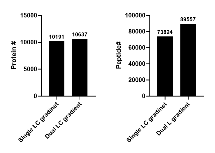 아래는 검출된 단백질과 펩타이드 수 입니다. 22.5% 이후의 분획에서 변경된 LC gradient 를 사용했을때 조금더 많은 수의 단백질과 펩타이드가 검출되었습니다. 암튼 둘다 만개이상의 단백질이상 검출되었습니다. 실험과정에서 특별한 노력이 없이 분석했는데도 많은 단백질이 검출이 되었습니다. 물론 단일 종 (Human)으로만 분석하면 이 숫자는 나오지 않을수도 있습니다. Thanks Orbitrap Eclipse!!