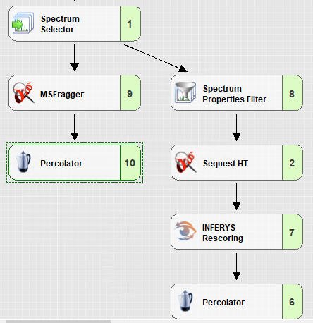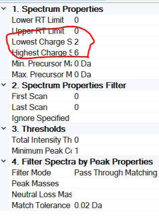 INFERYS Rescoring node는 펩타이드의 charge가 2에서 6 에서만 수행됩니다. 그러므로 Spectrum Properties Filter 를 추가하여 설정을 해야 합니다.