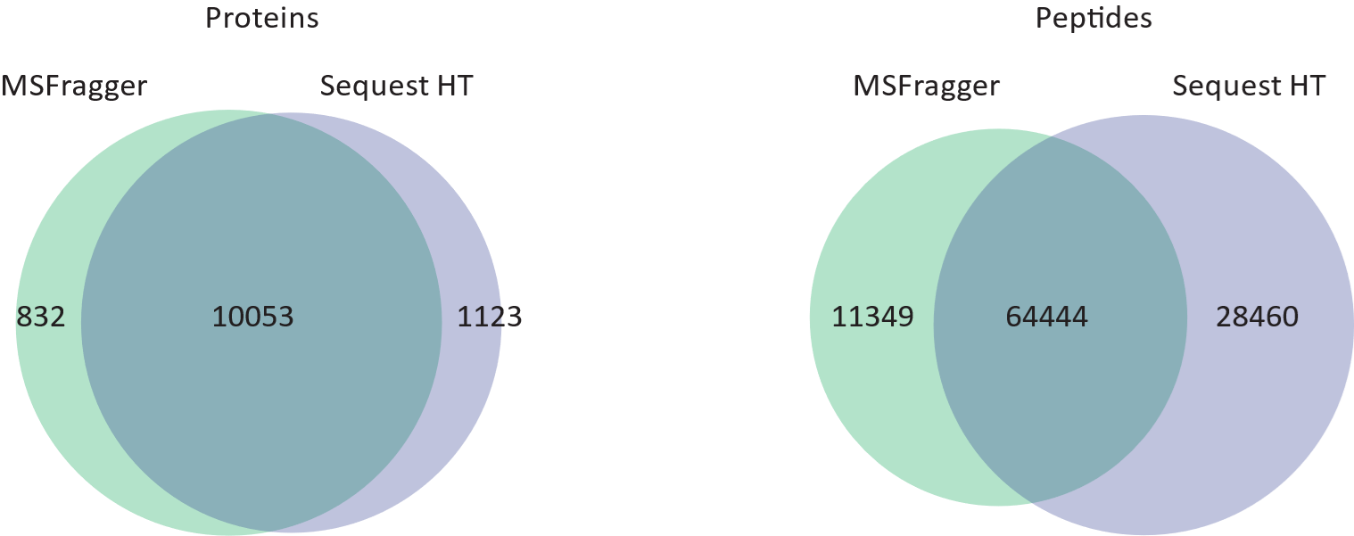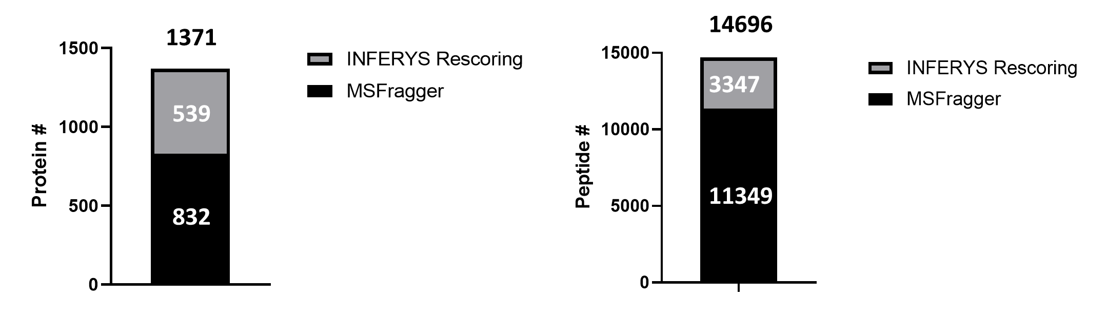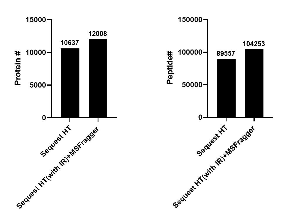아래는 검출된 단백질과 펩타이드 수를 나타내는 그래프입니다. MSFragger와 INFERYS Rescoring를 추가하여 약 1,400개의 새로운 단백질, 14696개의 새로운 펩타이드가 검출되었습니다.