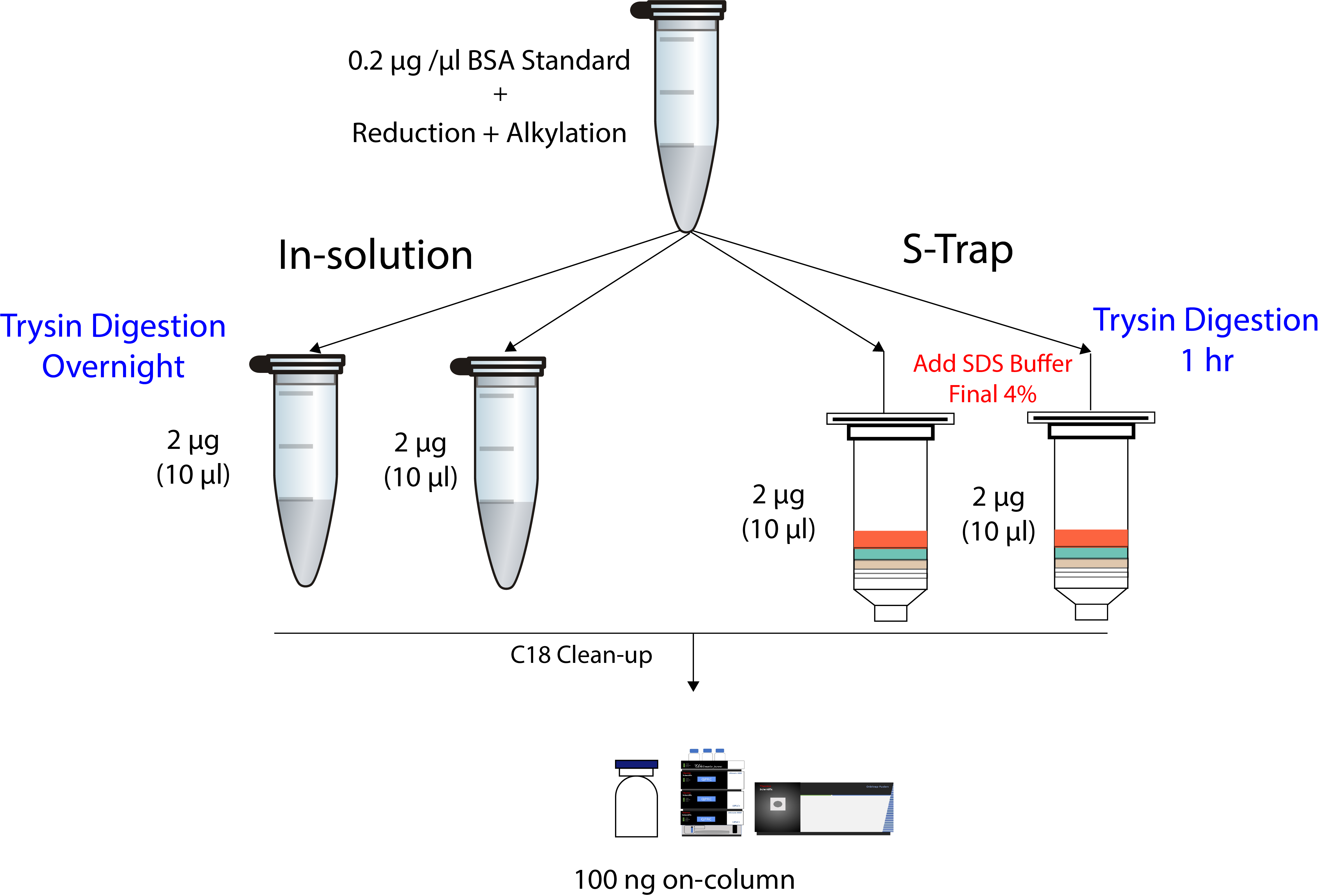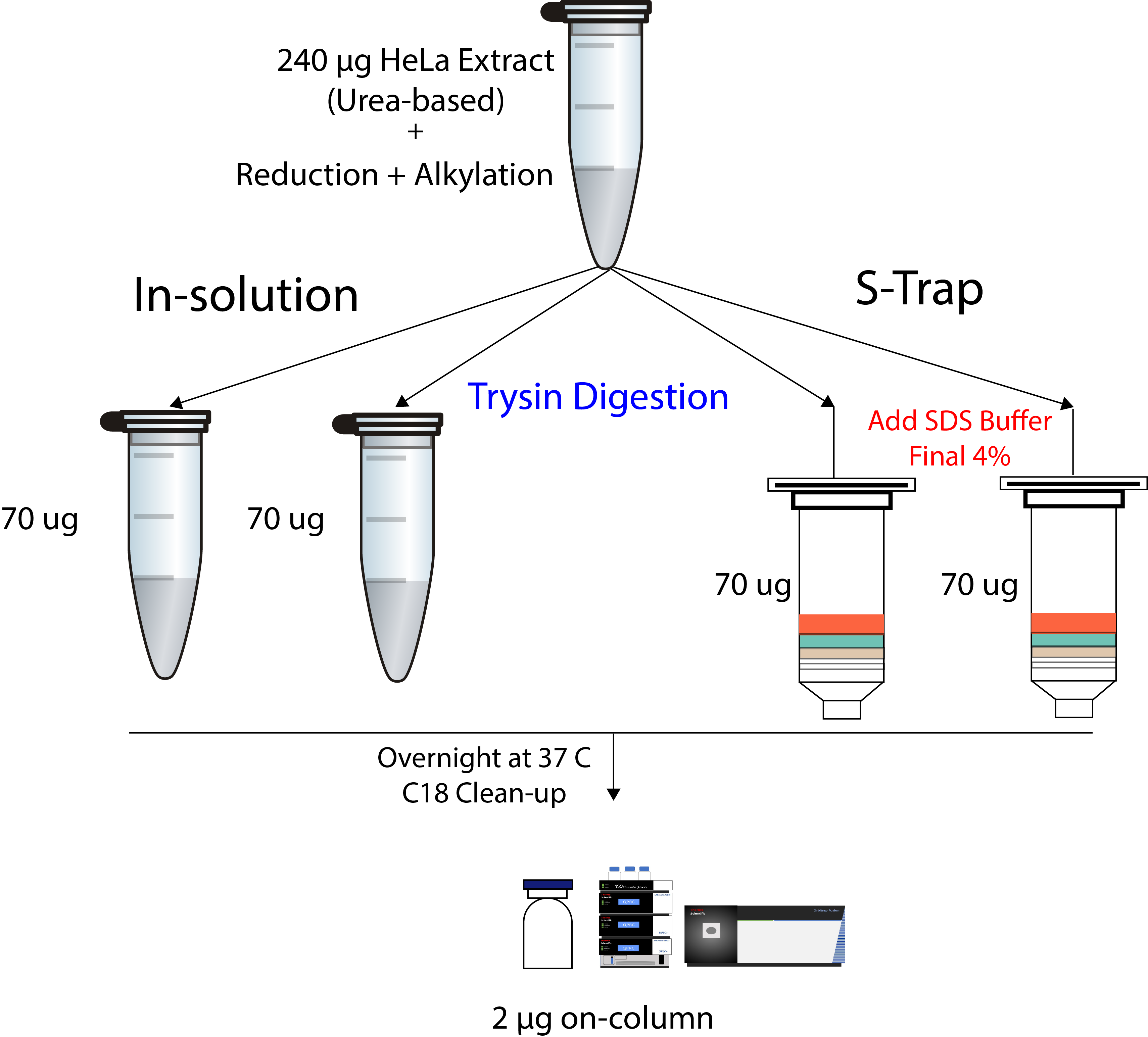 S-trap 에 loading 한 이후부터의 효율성을 테스트하기 위해서 아래와 같이 진행하였다. 먼저 Urea-based 추출한 HeLa extract를 reduction과 alkylation 기존방법 (in-solution) 과 S-trap 방법으로 trypsin digestion을 진행하였다. Kit의 loading capacity가 최대 100 µg임으로 70 µg에서 진행하였다.