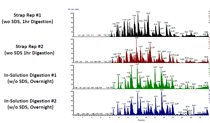 아래 그림은 각각의 분석에서 얻어진 크로마토그램이다. 그림에서 보듯이 크로마토그램 상에서는 거의 큰 차이는 없었다 (Figure 2). 이는 S-trap과정이 In-solution 과 비교했을때 시료손실이 거의 없다는 것을 말해준다.
