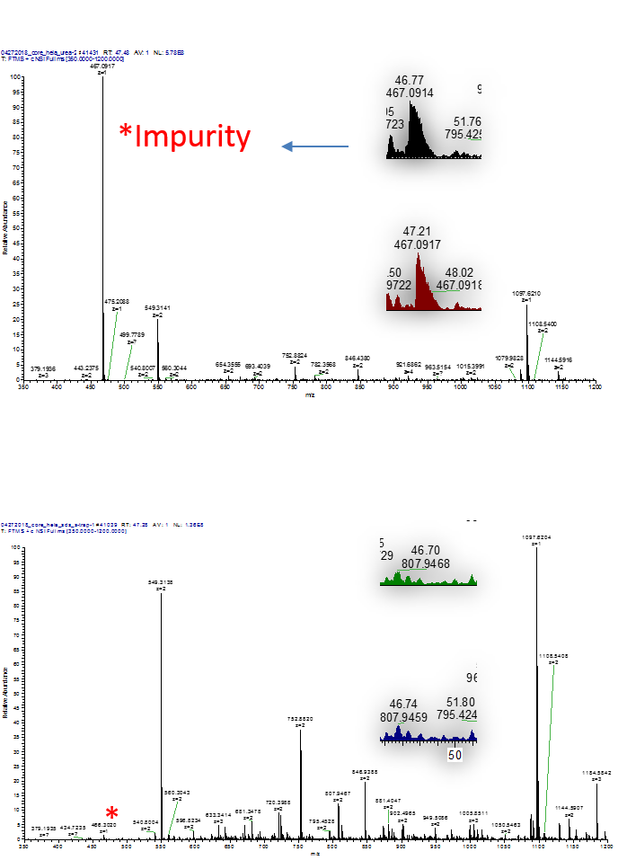 tryptic digestion후 각각 100 ng 으로 분석하였다. 아래는 각각에서 얻어진 크로마토그램이다(Figure 6). 아래 그림에서 보듯이 두 크로마토그램에서는 상이한 차이를 보이지 않았다.