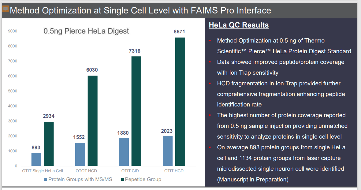 Orbitrap Eclipse와 FAIMS(60min LC time)를 이용하여 1ng HeLa standard에서 약 1500개의 단백질을 검출하였습니다.