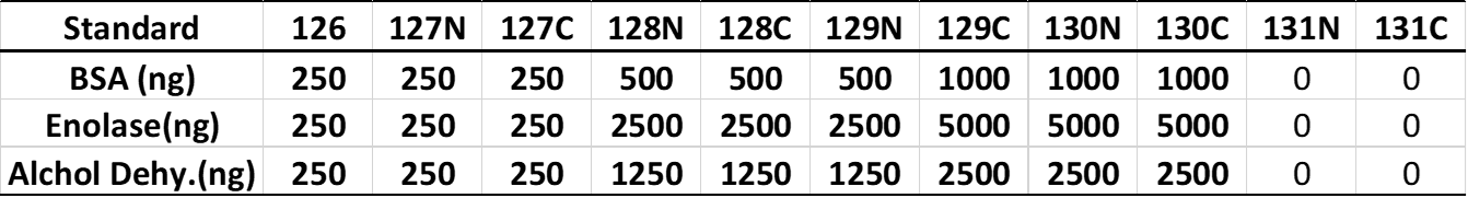 - 각각의 Standard protein digest를 위의 Table 비율로 첨가한후 TMT labeling을 합니다.