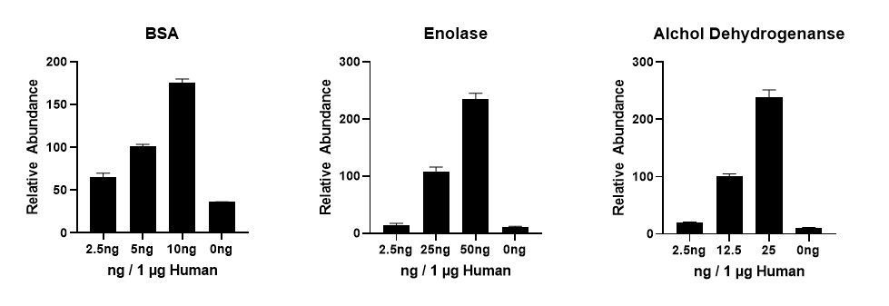 Kit의 Knock-out과 다르게 표준단백질을 일정 비율로 만듭니다. 어쩌면 실험에 더 가까울듯합니다. 이때 중요한것은 시료에 첨가할 표준단백질의 양입니다. 너무 적게 넣으면 검출이 되지 않으며 너무 많이 넣으면 전체 단백질의 양이 차이가 날 뿐더라 실제 실험모델에 적합하지 않습니다. 1µg human digest에 적합한 양을 찾기 위해서 시료 1µg당 1ng~10ng정도의 표준 단백질을 첨가하여 대략의 피크의 높이를 비교하였습니다. 1 µg human digest 당 10ng 표준단백질이 어느정도 잘 검출이 되었습니다. 최종적으로 아래와 같이 시료 100 µg 당 아래와 서로 다른 양의 표준 단백질을 첨가합니다.