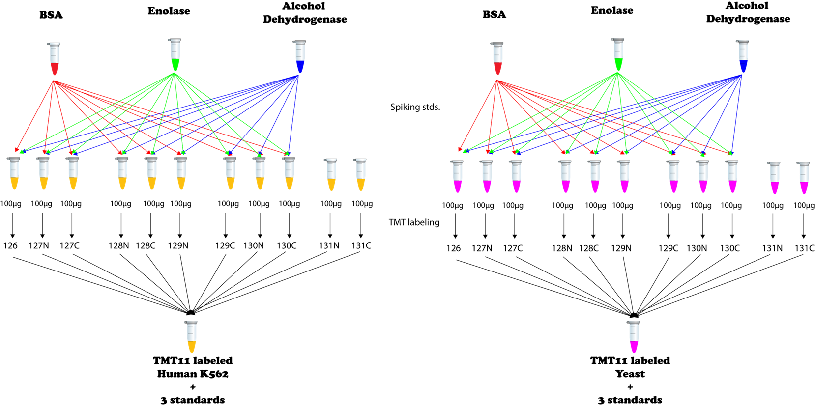 - 1개 TMT-11 kit로 1.1 mg Human 과 Yeast protein standard를 만들었습니다. 상당히 많은 양임으로 다양한 실험에서 최적화하는데 사용할수 있습니다.