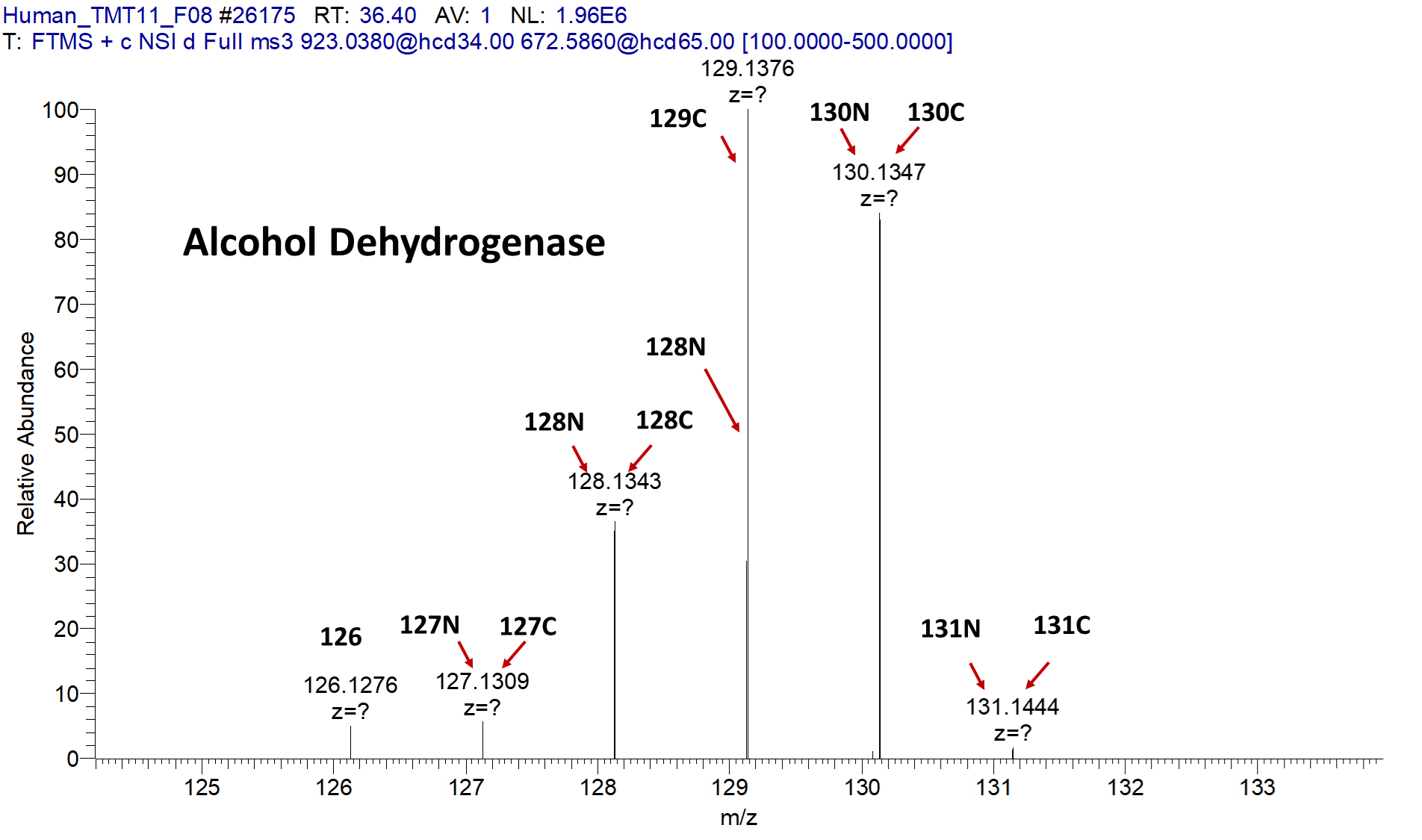 - 아래는 Alcohol Dehydrogenase 펩타이드중 하나의 Reporter ions입니다.