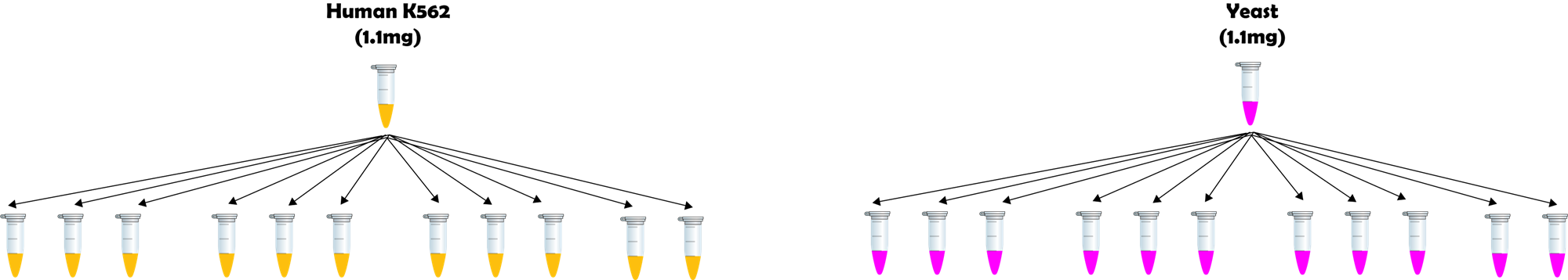 - Human K562 와 Yeast 시료를 tryptic digestion한후 11개의 Tube로 나누게 됩니다. 이때 주의할 점은 11개의 tube에 정확히 동일한 양으로 나누어야 됩니다. 11개 이기 때문에 1100ul의 buffer를 사용하여 100ul 옮기게 되면 마지막에는 100ul보다 적게 남게 됩니다. 이를 위해서 안전하게 약 1200ul 의 buffer를사용한후 100ul씩 옮깁니다. 나중에 조금남는 용매는 적은양 (예 5uL)으로 다시 나누어 넣습니다 (최대한 버리는 양을 줄일수 있습니다). 혹은 1.2mg을 digestion한 1.2mL의 용매로 녹인후 100uL씩 옮겨도 됩니다