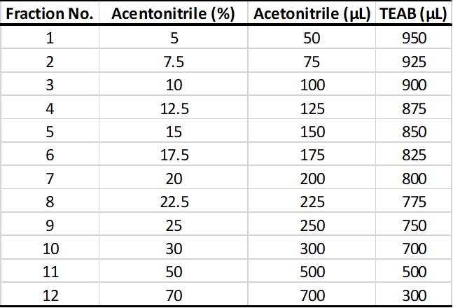 그러므로 본인이 주로 사용하는 Stage-tip 와 buffer를 정해서 최적화 시켜놓는게 좋습니다. 시료의 양의 제한이 없는 경우 보통 100 ug을 사용하여 분획합니다. 사용하는 컬럼은 harvar dapparatus사의 micro spin-colum (74-4601)을 사용합니다. 메뉴얼에는 capacity 가 60 µg까지라고 적혀있으나 100 µg 이상도 가능합니다. 최근 가격이 거의 두배로 올라서 다 사용하기 전까지 다른 제품을 찾아볼 예정입니다.