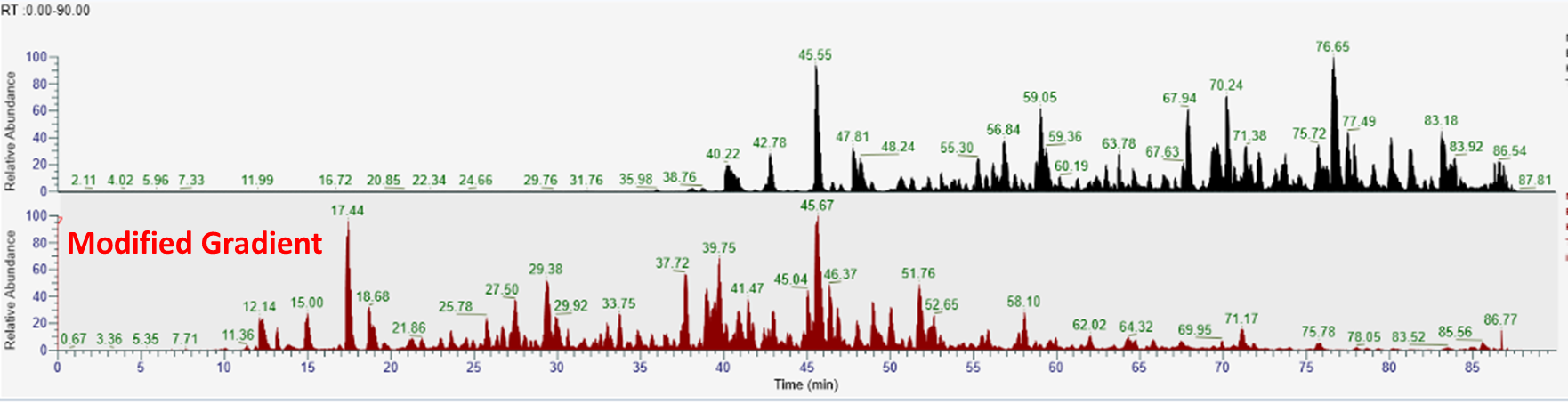 아래 크로마토그램에서 보듯이 펩타이드들이 더 넓게 분포되었습니다. 22.5% 이후에는 모두 이 조건을 사용하였습니다.
