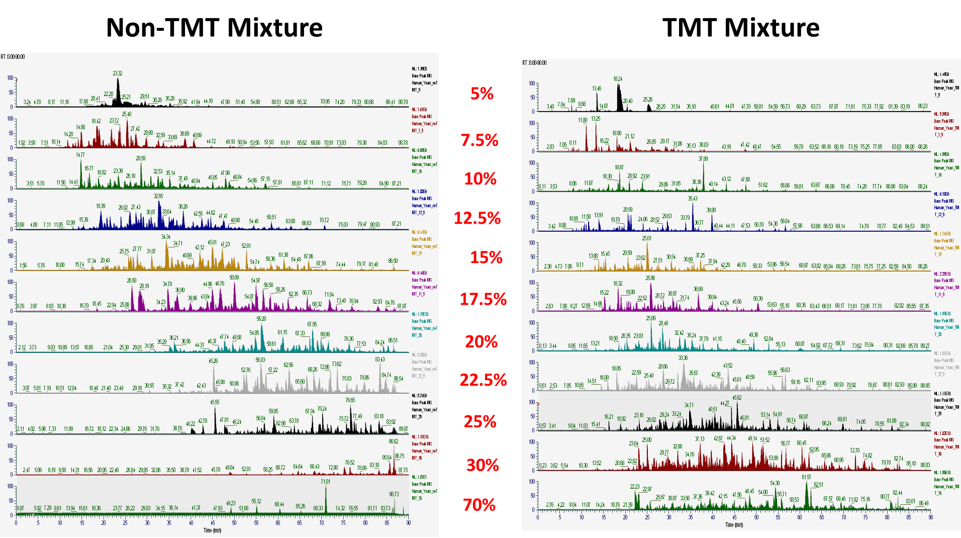 Non-TMT 시료의 경우 7.5%에서 부터 펩타이드들이 조금씩 용리되기 시작하였고 30%에서 모두 다 용리되었습니다.