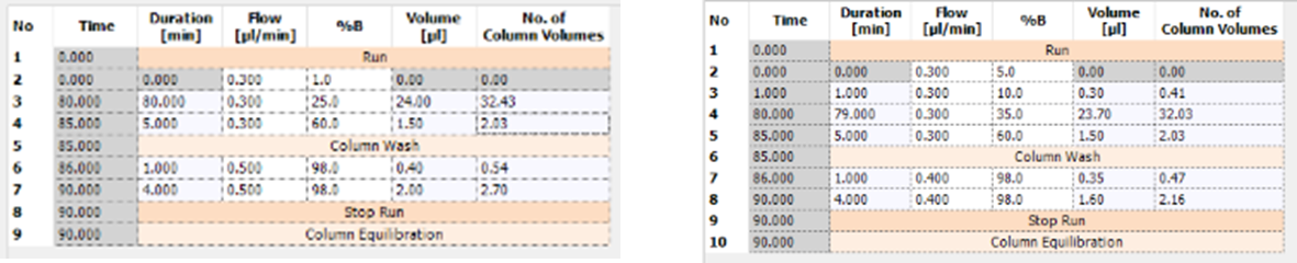 22.5% 이후는 상대적으로 크로마토그램이 오른쪽으로 치우쳐 있습니다. hydrophobic 펩타이드가 많이 존재하기 때문입니다. 22.5% 이후에는 gradient를 약간 조정해서 더 넓게 퍼지도록 하였습니다. LC gradient를 시작한후 1분후 바로 10% B로 증가시킨후 조금더 급격한 gradident를 사용합니다.