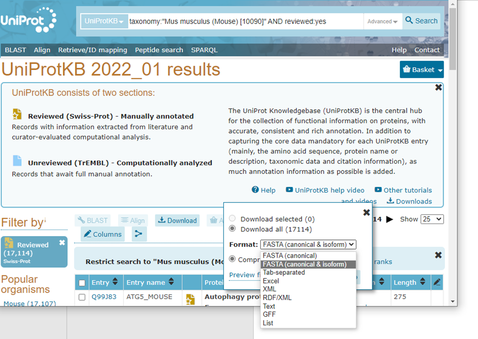 Uniprot에서 fasta file을 다운받게 되면 Canonical과 Canonical & isoform 이 보이게 됩니다.