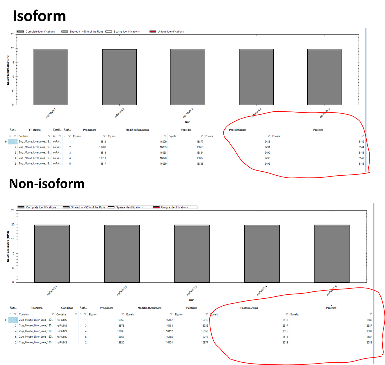 Biognosys의 Spectronaut에서도 유사하게 적용되니다. proteins 수에서 Isoform fasta 파일에서 더 많은 수가 나왔지만 Proteingroups 의 수는 거의 차이가 나지 않습니다. DDA분석에서와 유사한 패턴을 보입니다.
