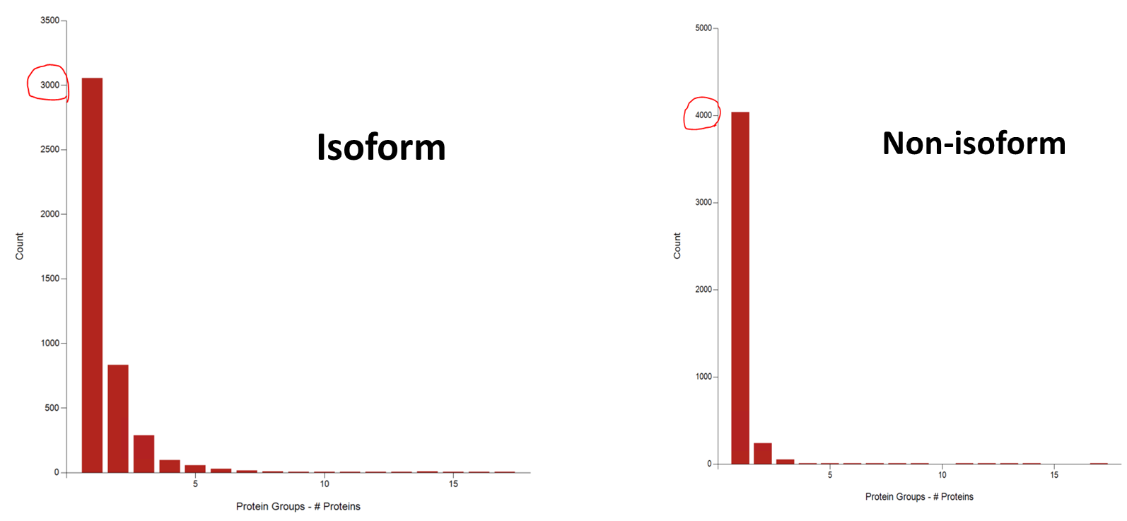 Proteingroup으로 포함된 단백질의 수의 분포도를 비교해보면 아래와 같습니다.Isoform fasta 파일에서는 약 3,000개의 단백질이 1개의 proteingroup으로 검출이 된 반면 non-isoform fasta파일에서는 약 4,000개의 단백질이 1개의 proteingroup으로 검출이 되었습니다. 즉 Non-Isoform fasta파일에서 검출된 단백질중 약 1,000개의 단백질이 Isoform fasta file에서는 2개이상의 단백질로 검출이 되었습니다. Proteome discoverer와 같은 프로그램은 이러한 isoform 을 한개의 단백질로 생각하기 때문에 실제 protein group의 수는 큰 차이가 없습니다.