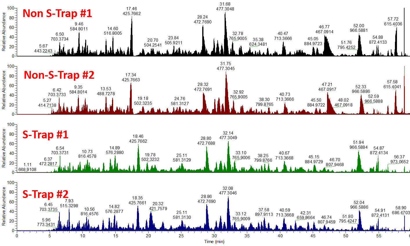 하지만 S-trap을 사용하지 않은 크로마토그램(위)에서 보이는 (약 46분)는 불순물 피크가 S-trap 처리시(아래)에서는 거의 보이지 않았다 (Figure 3). S-trap과정에서 이러한 Hydrophic substances들이 제거되것이라 생각된다.