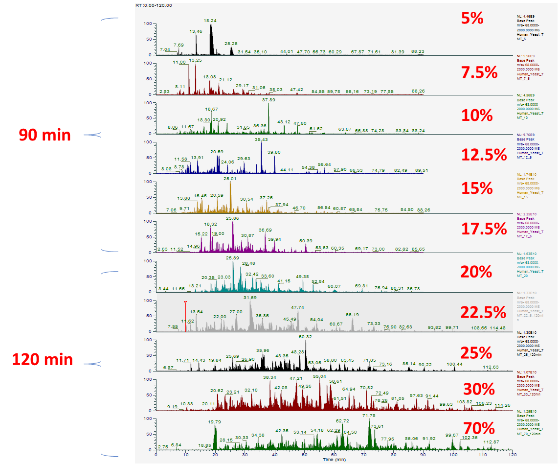 펩타이드가 상대적으로 많이 용리되는 영역인 22.5~70% 분획은 다시 120min gradient로 한번더 분석하였습니다.