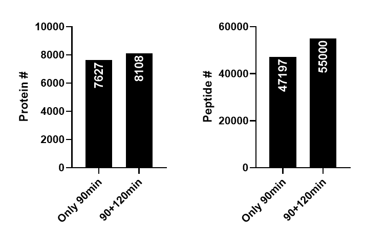 - 아래 그래프에서 보는것과 같이 120min가 포함된 결과에서 추가적인 단백질과 펩타이드가 검출되었습니다. 당연한 결과인듯합니다. 모든 분획을 120min으로 하면 더 많은 수가 검출되겠지만 상대적으로 펩타이드가 많이 용리되는 부분만 120min을 사용할 예정입니다.