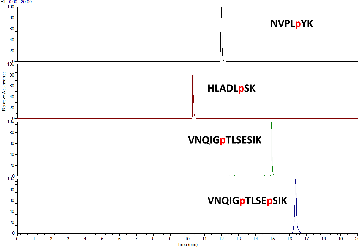 - 4개의 Phosphopeptide에 대한 Extraction Ion Chromatogram 입니다.