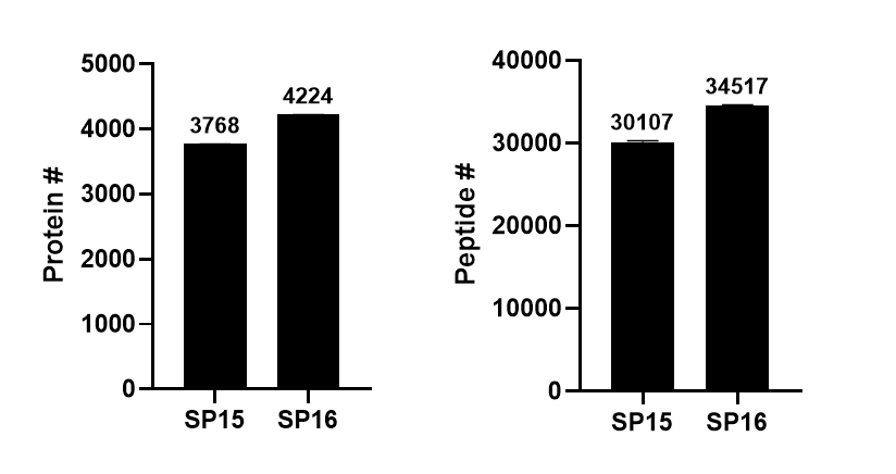 - 이전에 검출했던 200ng HeLa 시료를 두 버젼에서 각각 분석해보았습니다. 아래와 그래프에서 보듯이 동일한 raw 파일이지만 SP16버젼에서 각각 12%, 10%의 단백질과 펩타이드의 수가 증가되었습니다.