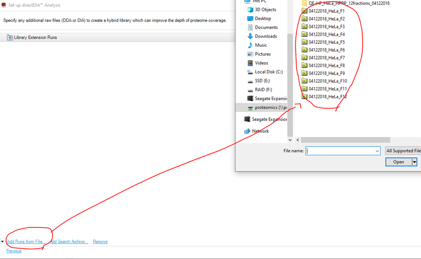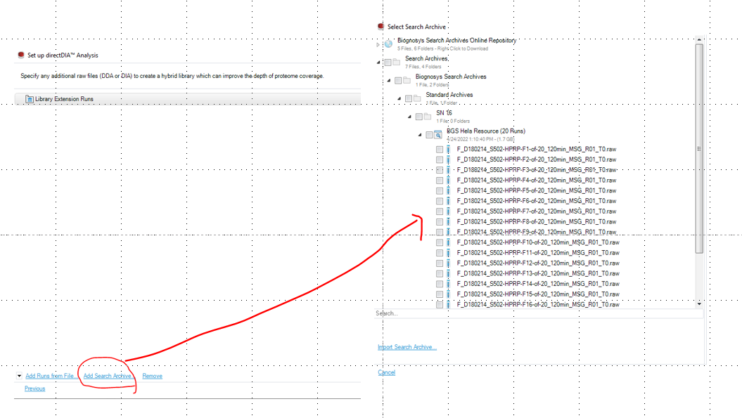 - 아래와 같이 DDA raw파일을 추가할수있는 단계가 있습니다. 이때 기존에 사용했던 DDA파일 첨가하면 DIA 분석시 DDA raw 파일들을 spectra-library처럼 사용할수있습니다. 따로 DDA에 대한 Spectra-library가 필요없습니다. 아래와 같이 기존에 DDA 파일들을 첨가합니다.