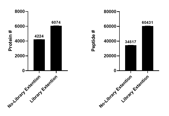 아래 그래프에서 이 기능을 사용했을때의 수의 증가를 보여줍니다. DDA 파일을 첨가한후 상당한 수의 단백질과 펩타이드가 추가적으로 검출이 되었습니다. 단백질 및 펩타이드에서 각각 30%, 40%의 수가 증가되었습니다. 상당한 수의 증가입니다.