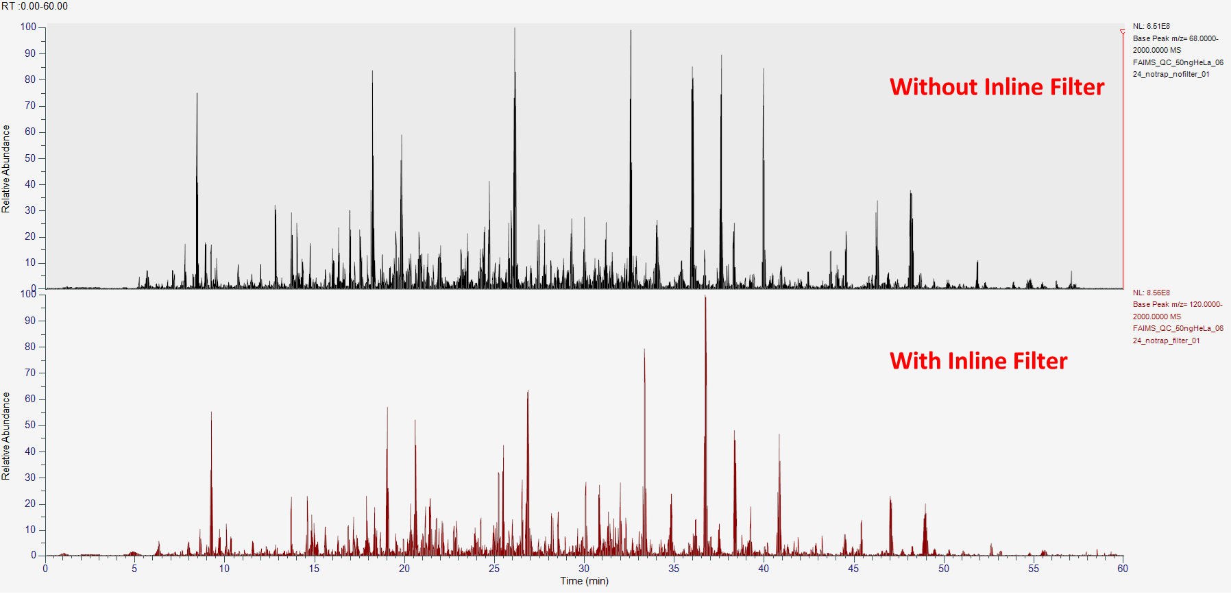 - Inline Filter를 장착하지 않은것과 장착했을때 크로마토그램을 보면 거의 동일합니다.