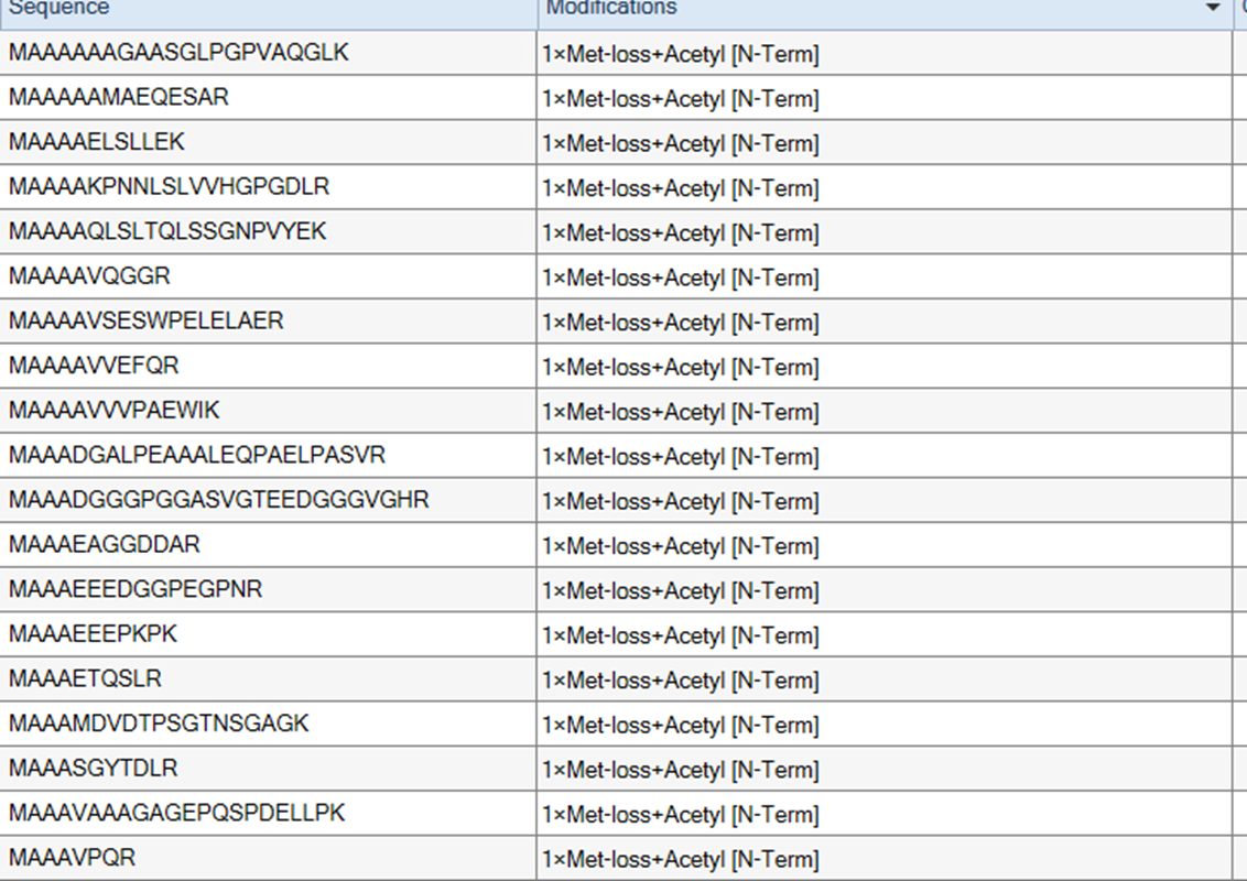단백질의 N 말단의 Methione의 절단이나 N-α-acetylation 은 일반적인 Modification중에 하나입니다. Proteome Discoverer 의 SEQUEST 검색엔진은 이 Modification이 기본값으로 설정되어 있습니다.