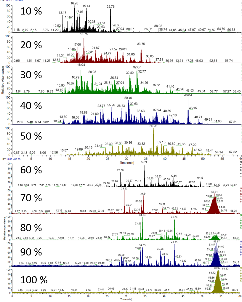 아래 그림과 같이 Carbon spin-column을 30 µg을 10~100 % ACN in 0.1% TFA 로 10개 분획을 하였다(Figure 2). 각 분획은 LTQ로 분석하였다(Chromatogram 확인용).