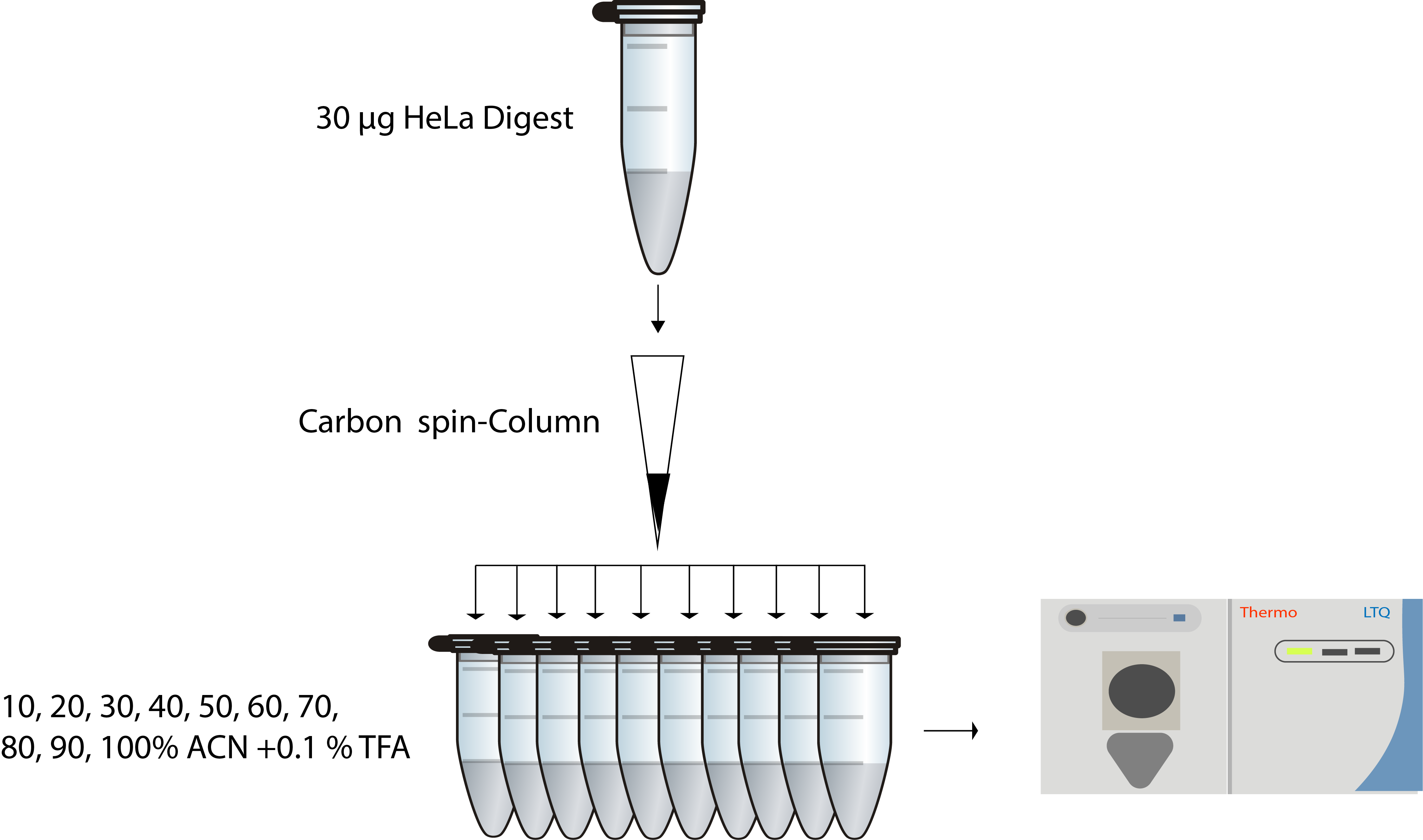 이 컬럼을 이용해서 hpRP와 같이 펩타이드를 분획하였다. hpRP에서 사용하는 high pH buffer가 아닌 간단히 유기용매의 %에 따라 분획을 하는것이다. Carbon과 펩타이드의 상호작용은 C18과 다르게 순수한 hydrophobic interaction이 아니다. 그러므로 유기용매의 증가에 따라 분획후 각 분획을 C18 analytical column으로 분석하게 되더라도 큰 문제는 없을것이다
