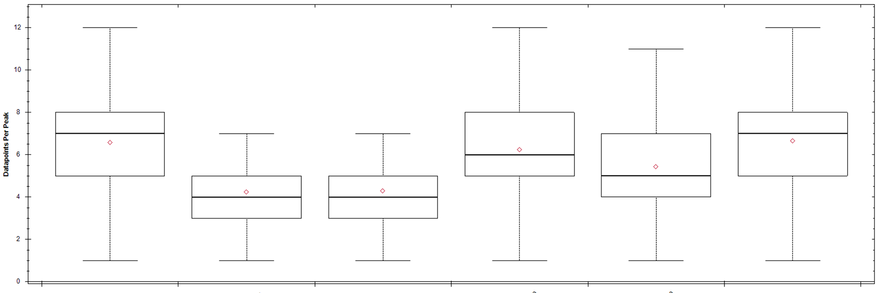 하지만 DIA를 이용한 정량분석에서는 정량성도 고려해야 함으로 Data points도 같이 고려해야 합니다. 1ng 시료의 경우 많은 data point를 얻기는 쉽지 않는것 같습니다. 아래와 같이 분석방법에 따라 평균 data-point수가 다양합니다.
