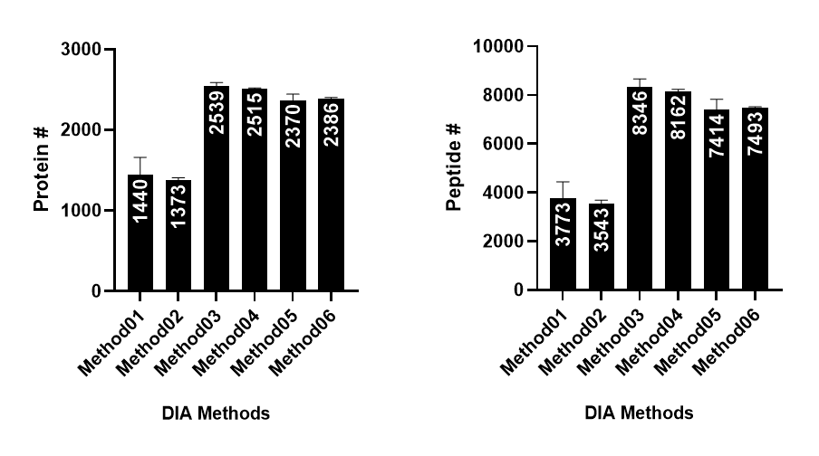 아래는 각 방법에서 검출된 단백질 및 펩타이의 수입니다. 2500개의 단백질이 가장 많은 수입니다.