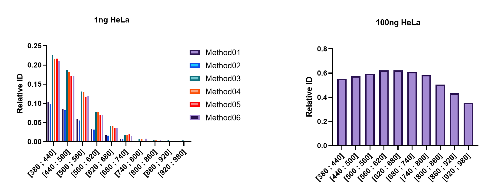 Data-point를 증가시키는 방법중 하나는 Isolation window구간을 줄이는것입니다. 아래는 1ng와 100ng의 HeLa 시료를 DIA로 분석했을때 m/z구간 별로 검출된 단백질수의 비율입니다. 1ng의 경우 m/z800 이상에서는 거의 검출이 되지 않은것을 알수 있습니다. 이러한 점을 고려할때 m/z800 이하까지만 분석하게 되면 동일한 조건에서 data point 수를 약간 증가시킬수 있습니다.
