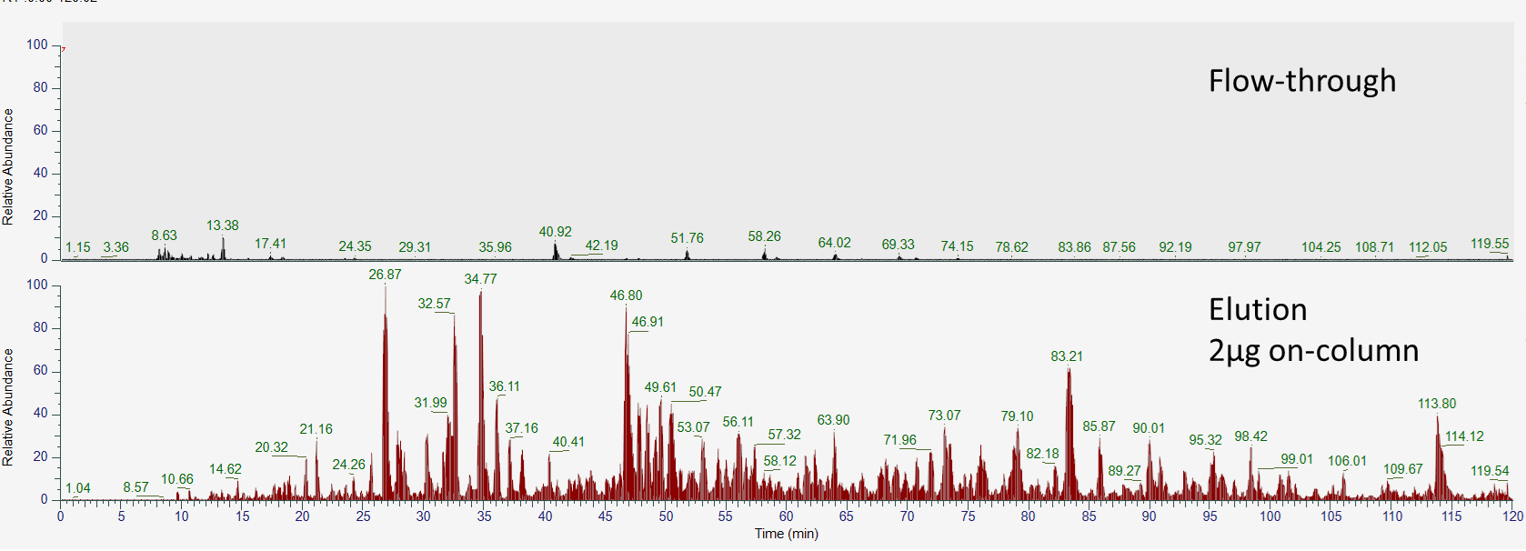 Clean-up과정에서 얻어진 Flow-through와 Elution 을 각각 분석해보았는데 Flow-through에서는 펩타이드가 거의 검출이 되지 않았습니다.