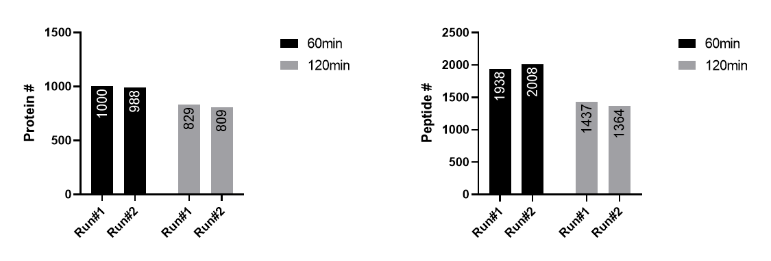 아래는 검출된 단백질과 펩타이드 수입니다. 60min LC gradient에서 1000개정도의 단백질이 검출이 되었습니다. 120min LC gradient에서 검출 수는 약간 줄어들었습니다. 극미량의 단백질의 경우 긴 LC gradient가 크게 효과가 없는 것 같습니다.